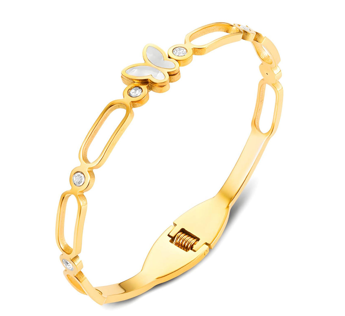 Soigneusement confectionnée en acier inoxydable plaqué or de première qualité, cette pièce sublime instantanément n'importe quelle tenue, de l'ordinaire à l'extraordinaire. Son motif papillon symbolise la transformation : c'est exactement ce qui se passe lorsque vous l'enfilez.