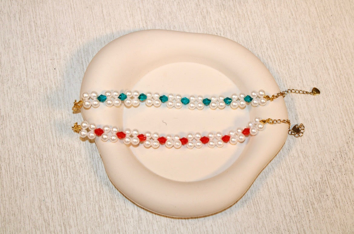 Each bracelet is lovingly handcrafted with delicate pearl beads arranged into floral clusters, accented by vibrant crystal beads in bold turquoise or classic red. Finished with a gold-plated adjustable chain and signature heart charm, this bracelet offers both comfort and sophistication.